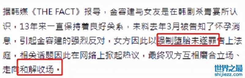 金容建在得知女友怀孕并打算生下来之后强烈反对,称自己年事已高,不便于抚养孩子。女方因此以强制堕胎未遂罪将金容建告上了法庭,最终两人以和解结束此事。