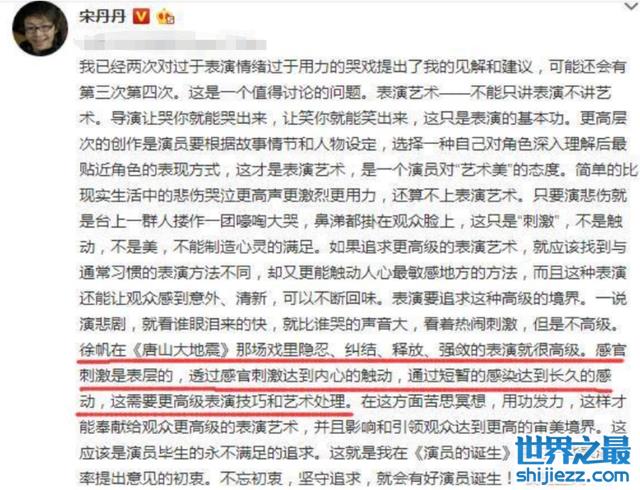此外,宋丹丹还在自己的社交平台上夸赞过徐帆的演技,她称赞徐帆在《唐山大地震》的表演非常的高级,她说感官的刺激是最表层的,而徐帆在那场戏中的隐忍、纠结、释放能给予人一种内心的触动,这是更高级的表演技巧和艺术处理。