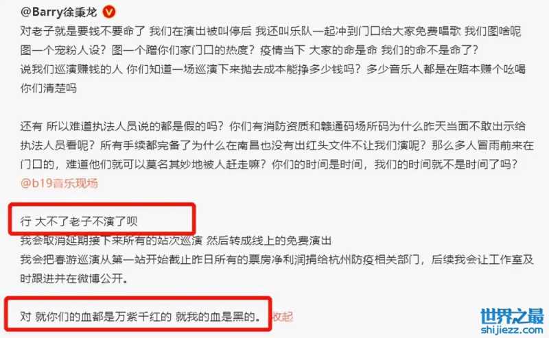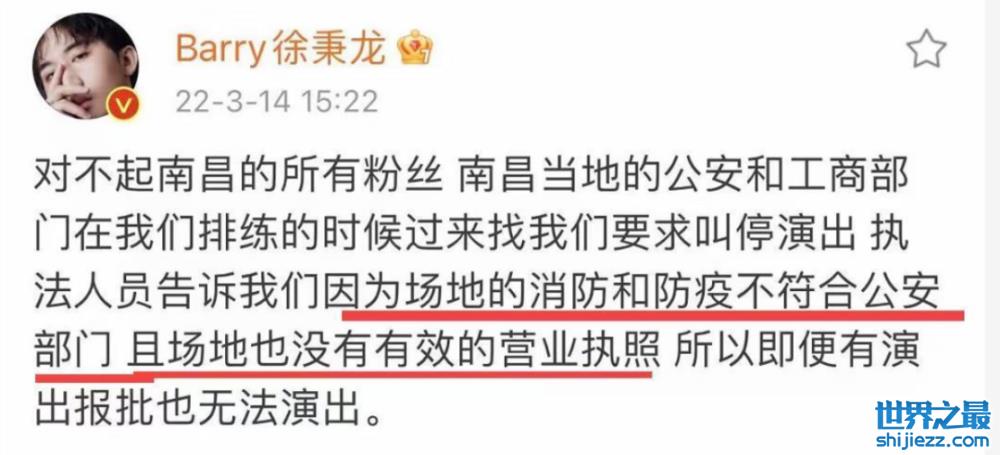 徐秉龙突然“发疯”这事儿说起来还挺抓马。在咱观众都已经习惯收到因为疫情取消演出的消息时,他的团队却因为演出取消破防,甚至还和场地方隔空撕起来了。徐秉龙直接发微博甩锅,说取消演出是因为场地的消防和防疫不符合规定,还没有有效的营业执照。