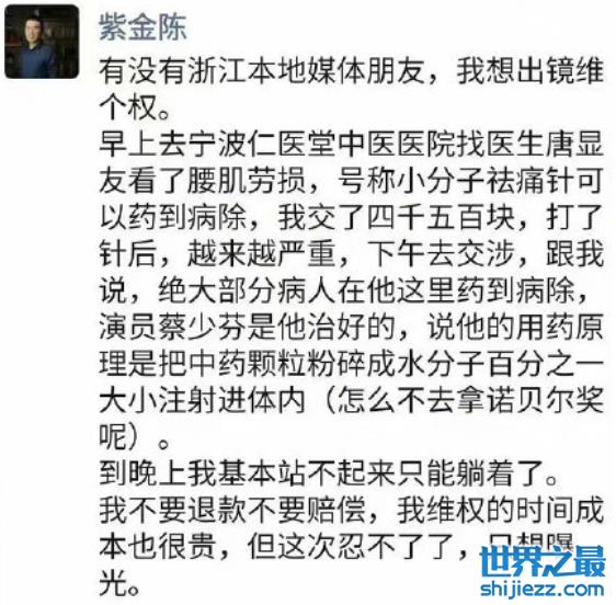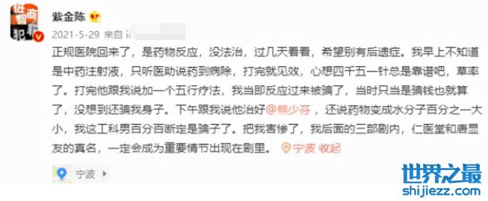 医院的谎言说得花里胡哨,什么水分子和治好蔡少芬一通乱拳输出,就给紫金陈整迷糊了。果真“药到病来”,一打完紫金陈晚上就直接站不起来了,气得他直接发朋友圈说要出镜维权。