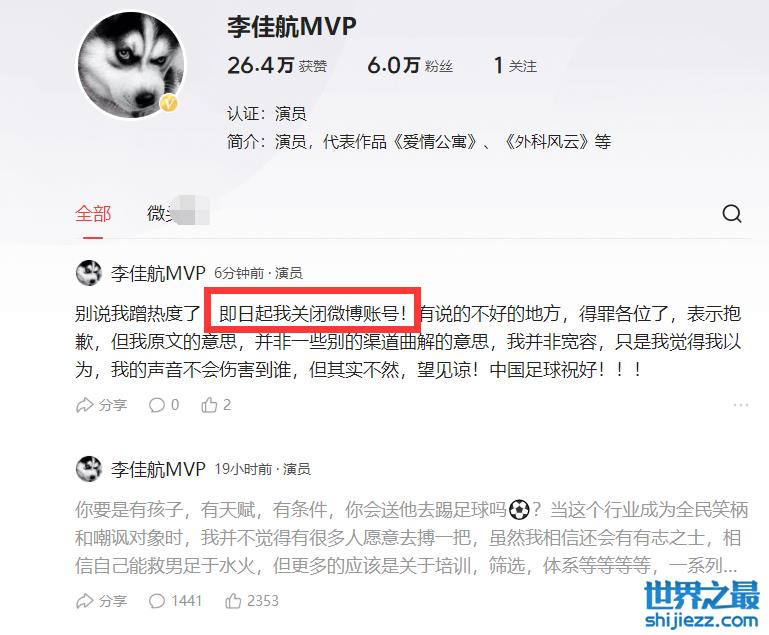 李佳航为男足发声后,决定关闭微博账号,别说我蹭热度了