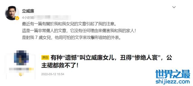 近日,立威廉在自己的社交平台上称,有一篇关于文章引起了自己的注意,因为这是一篇非常伤人的文章,对立威廉年仅7岁的女儿用了很非常可怕的文字来形容她的外貌,他也贴出该篇文章的链接,能看到标题用词确实十分伤人。
