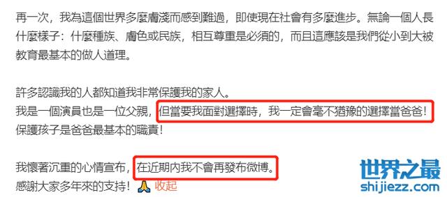 并且,立威廉还在文中是对这个世界还有这么多肤浅的人感到难过,不管容貌或肤色都应该互相尊重,这是做人的基本道理,也说在演员与父亲之间会毫不犹豫的选择当一个父亲,所以为了保护家人,他宣布在近期内不会再发布微博。