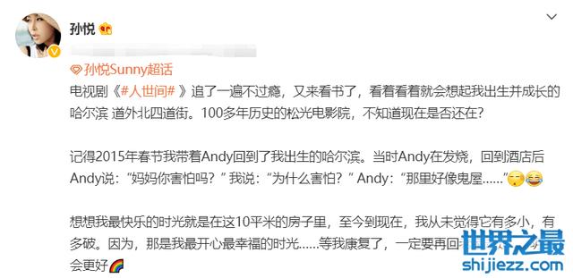 之前因为一些意外导致孙悦的腿骨折了,在只能坐轮椅的日子里,孙悦更是十分想念家乡,她在社交平台发文称也不知道已经有100多年历史的电影院现在还在不在,希望自己痊愈后能回老家看看。