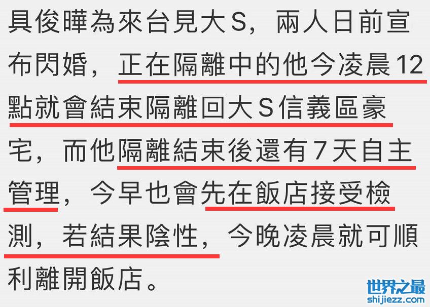 报道称,具俊晔将在19日一早接受检测,若结果是阴性则今晚凌晨就可以顺利离开饭店,台媒也收到消息称,隔离结束后具俊晔将回大S信义区豪宅与妻子见面,而后还有7天自主管理。