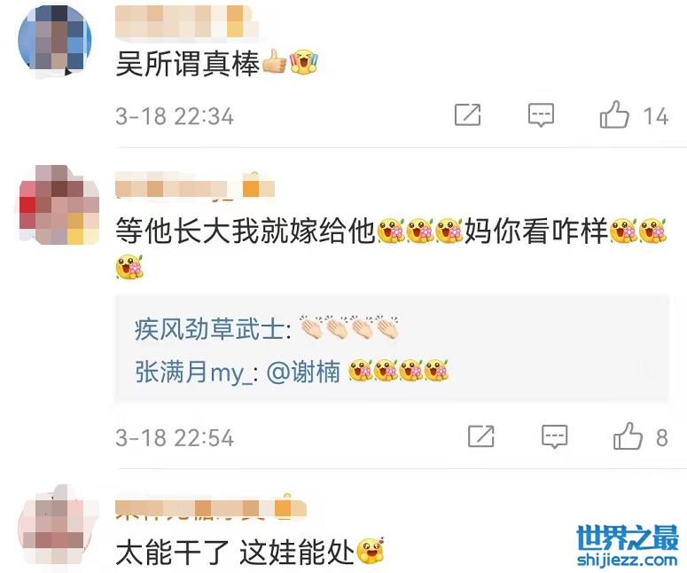 看到这么贤惠的男孩子,网友和粉丝纷纷在谢楠的评论区留言,有网友称赞吴所谓很棒,有粉丝还开玩笑地叫谢楠妈妈,称等吴所谓长大就嫁给他,真是十分搞笑。
