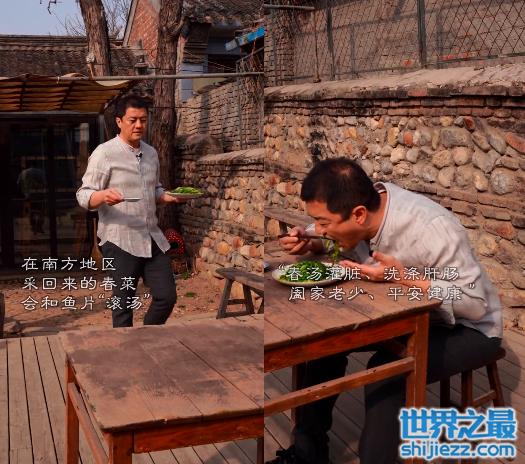 不仅要挖,李亚鹏还在屋里将野菜加工好,自己坐在桌子边大口吃上了野菜。并称做好的野菜叫“春汤”,春分这天有吃“春汤”的习惯。所有的动作习俗看起来十分的熟练,想必李亚鹏对这些传统节气很是了解。