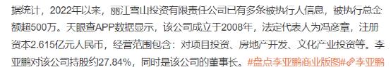就在今年1月份,李亚鹏担任董事长及股东的丽江雪山投资有限责任公司新增被执行人信息,执行标的高达186万元。前不久,李亚鹏关联公司丽江雪山投资有限责任公司又新增了一则被执行人信息,再被强制执行53万余元。据媒体报道,目前这家公司被执行总金额已经超过了500万。