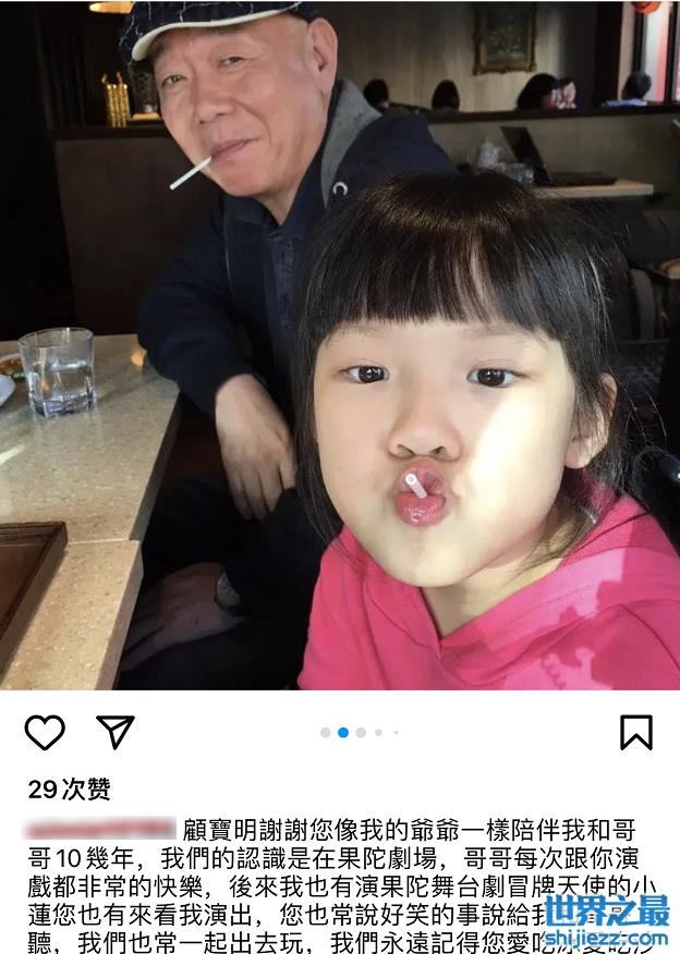 两人最后一次见面是在去年,好友也公开了其合影,他直言顾宝明像爷爷一样陪伴着他和哥哥10几年,两人是在果陀剧场认识的,还直言顾宝明经常说好笑的事情给他和哥哥,另外也经常一起出去玩,也永远记得顾宝明爷爷爱吃冰爱吃沙琪玛。
