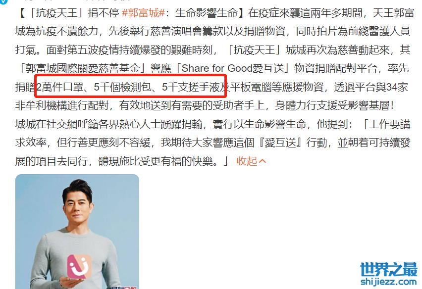巨星郭富城也是一直都在努力为大家捐赠更多的物资,几天之前他就率先捐赠出了两万个口罩,五千个检测包和五千只洗手液和平板电脑等许多可以给与应援的物资,希望能够帮助大家环节目前的紧急情况。
