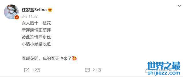就在网友猜测时,Selina大方承认新恋情,写道:春暖花开,我的春天也来了。