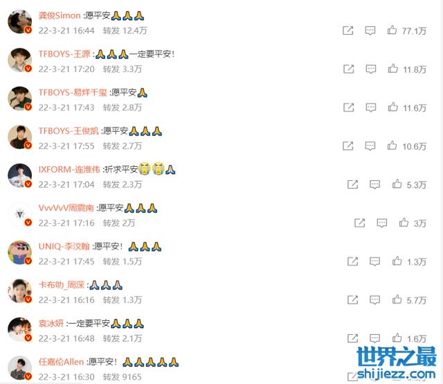 除了以上几位,在报道东航客机发生事故的消息下,众多明星也是纷纷送上自己的祝福,龚俊、王源、易烊千玺、周深等都希望飞机上的乘客和机组成员平安无事,其粉丝也是纷纷转发微博,对发生事故的客机送上自己的祝福。