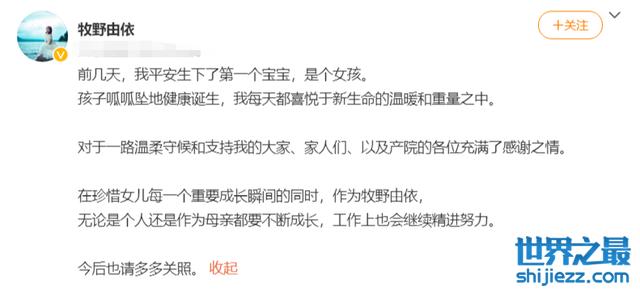 近日,山口百惠的儿媳牧野由依在其社交平台上给大家分享了一个喜悦的消息,她称在前几天已经平安生下来第一个宝宝,是个女孩,她说自己因为还在健康诞生,每天都喜悦于新生命的温暖与重量之中,她还感谢一路以来支持自己的大家还有家人们,看得出心情十分喜悦。