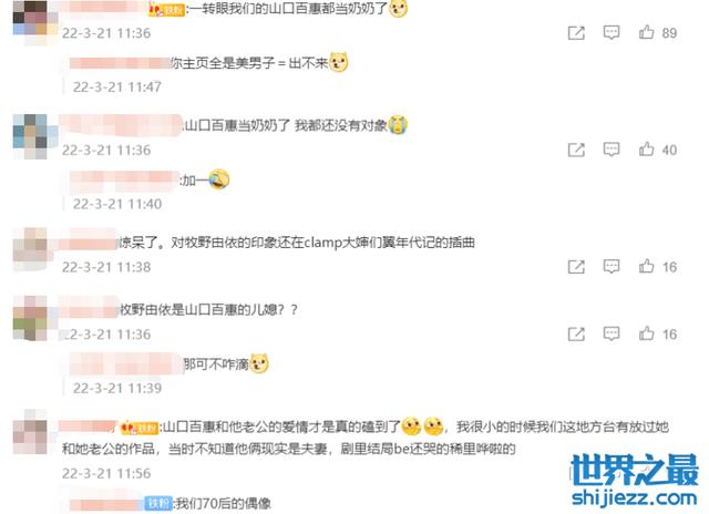 而这则喜讯下网友们除了恭喜牧野由依喜得贵子外还震惊于牧野由依居然是山口百惠的儿媳,直说感觉次元壁破了,还有人感叹道一转眼我们的山口百惠都当奶奶了,而自己还没有对象,更有网友回忆起了山口百惠之前的作品,对他们一家的感情感到羡慕,称山口百惠是70后的偶像。