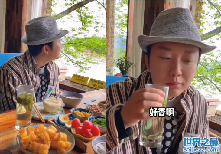 从侧面我们可以清楚地看到李玉刚的面前一共摆了七个碟子,水果、鸡蛋、油条等等应有尽有,确实十分丰盛。不吃菜品的李玉刚茶也不喝,只是拿着闻了闻味道,不知道他是不是为了保持身材。当天的环境也十分优美,位置在河边,想必看着这样的美景,不吃饭也能饱。