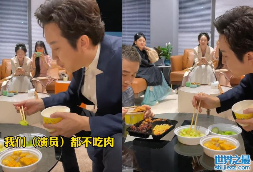 在表演后台吃饭时,李玉刚这次硬气了起来,面前摆着三个菜,虽然全是素菜,但胜在健康。李玉刚说“我们都不吃肉”,但没想到打脸来得太快,坐在他对面的演员餐盒里大鱼大肉十分丰盛。一对比李玉刚的菜,让人莫名多了一丝心酸。