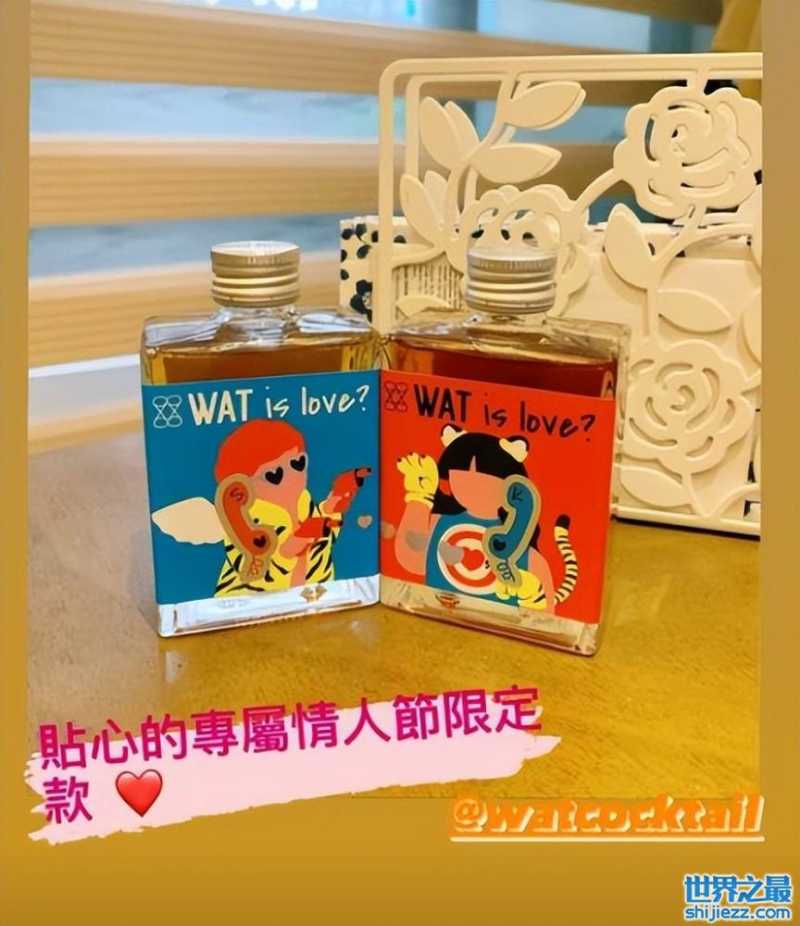另外一张独立的照片之中,大S是这样子配文的:贴心的专属怀人节限定款。后面还带着红红的爱心,另外仔细看这两瓶酒,就如情侣一样的存在。一红一蓝,然后上面的是“is love”。