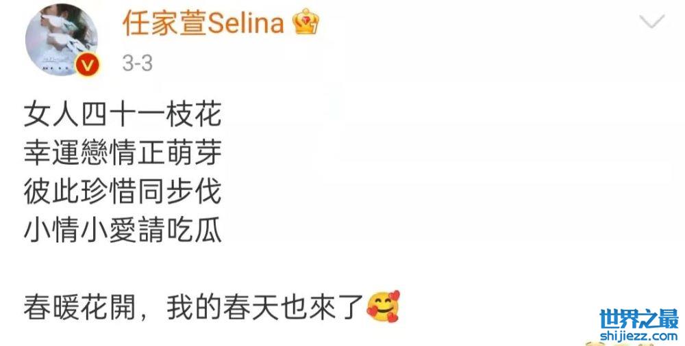 向来大方的Selina,知道自己恋爱的新闻出来后,她第一时间承认恋情,官宣时附上一首打油诗,“女人四十一枝花,幸运恋情正萌芽,彼此珍惜同步伐,小情小爱请吃瓜”。