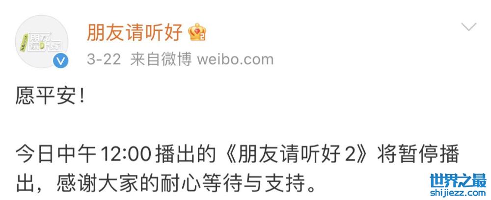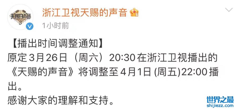 综艺《朋友请听好2》也宣布最新一期节目暂时取消上线,浙江卫视的王牌综艺《天赐的声音》播出时间也宣告更改,将于4月1日与广大观众朋友见面。