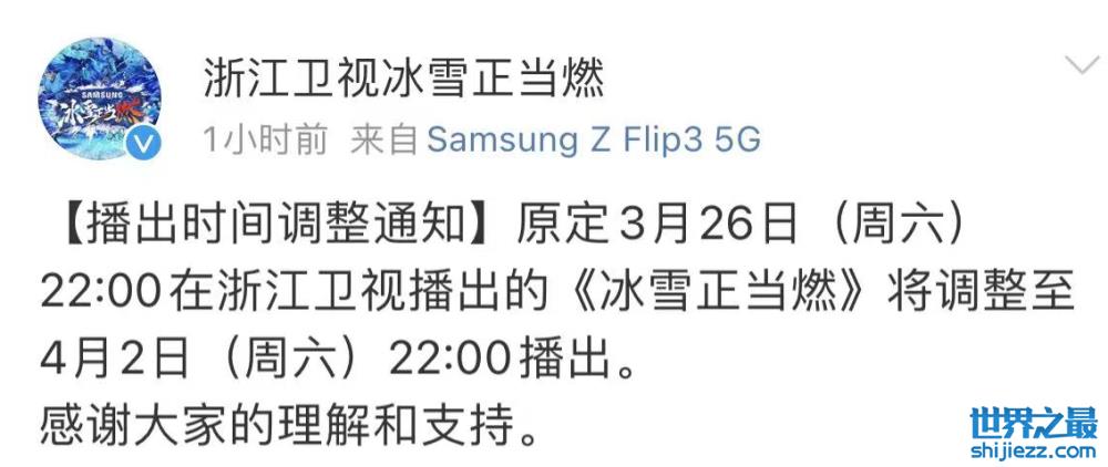 据悉,原定3月25日20:20分在浙江卫视播出的《王牌对王牌》将调整到4月1日(下周五)播出,王牌节目组更是连节目预告都没有放出,为此节目组还特别感谢大家的理解与支持。