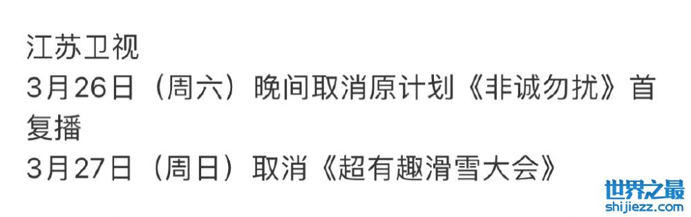 江苏卫视的娱乐综艺同样暂时取消上线,其中包括3月26日的《非诚勿扰》首复播,还有3月27日的《超有趣滑雪大会》。