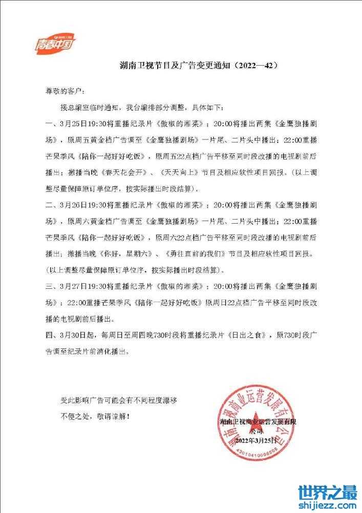 各大省级卫视的综艺也纷纷动作一致,撤播本应该这周上线的节目。 其中,湖南卫视还宣布撤播3月25日晚上的《春天花会开》与《天天向上》,以及3月26日晚上的《你好,星期六》与《勇往直前的我们》。
