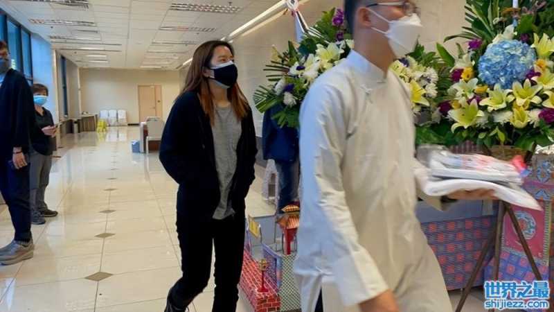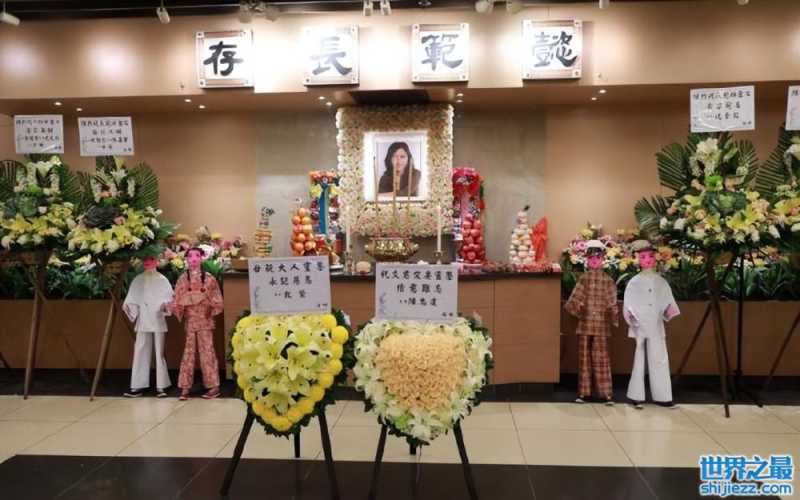 整个灵堂布置比较低调,并且祝文君的遗像被鲜花围绕,许多的花牌与悼念花篮都摆在灵堂的两侧。因为祝文君生前喜欢彩色的鲜花,所以女儿和老公特意选择了她最爱的鲜花装饰。
