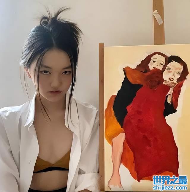 除了这幅母女合照的油画外,一旁的李嫣也是十分引人注目,她素颜出镜五官和爸爸妈妈都有几分相似,但仔细看还是能看出嘴部有一些疤痕,并且她的穿搭十分大胆,仅仅只穿了一件内衣外面则披了件白衬衫,和她的年龄相比似乎有点成熟。