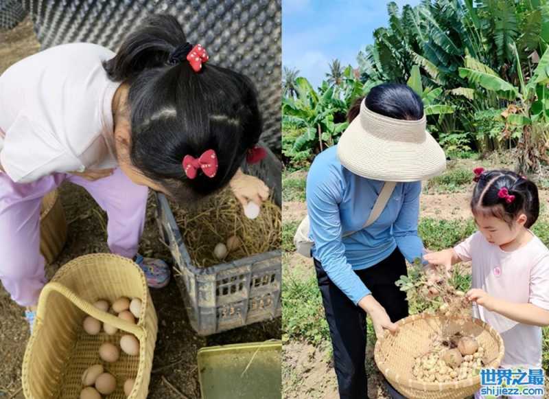 在摘完花生后,两个孩子更是去到了兔子棚边专心致志地观察着这一群喂养的小兔子。而王楠女儿也十分大胆,还进入到鸡棚当中,去鸡窝里捡新鲜鸡蛋,体验着别致的劳动乐趣,也是一种对孩子非常好的素质教育。