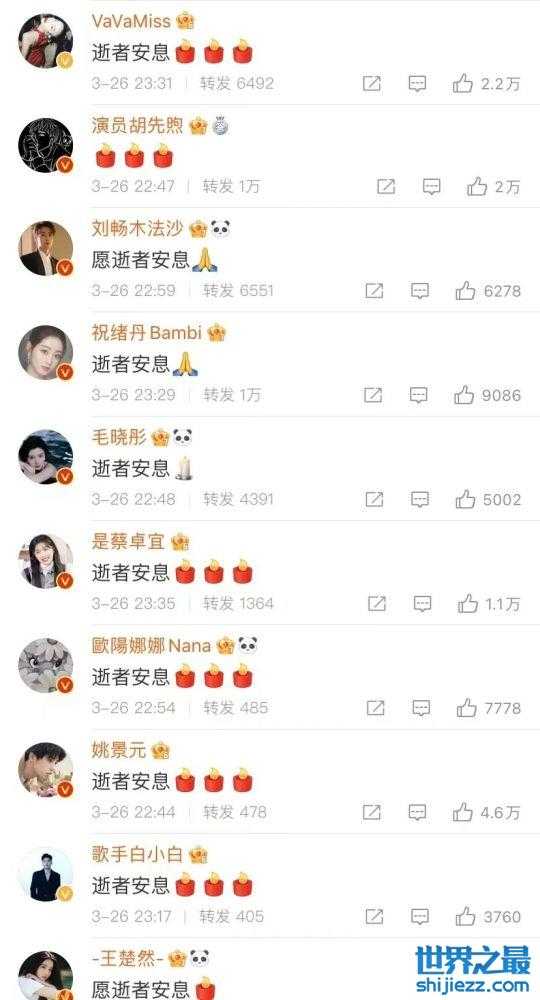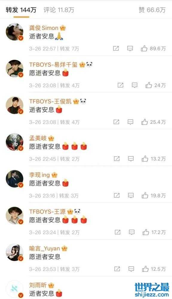 而作为娱乐圈中的明星艺人们,已有近500位明星转发为遇难者默哀的内容,从转发名单中可以看到杨幂、易烊千玺、张艺兴、王嘉尔、关晓彤、龚俊、虞书欣等艺人们都纷纷转发。