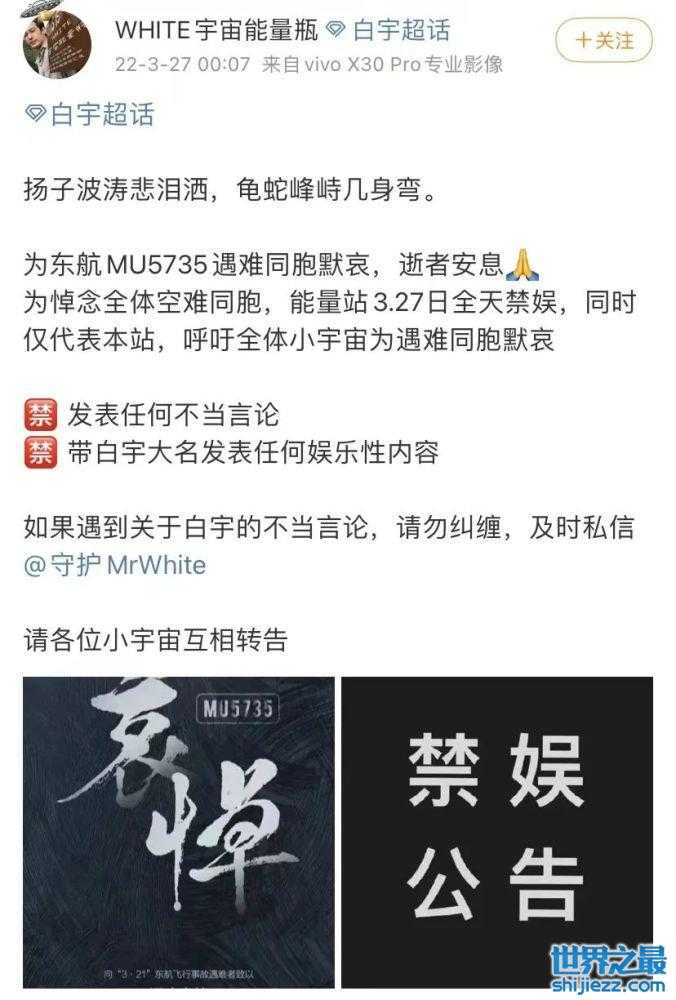 对于热门网综和卫视王牌综艺的停播,广大观众们也都表示支持与理解,这种人性化的做法得到了一致好评。为悼念全体空难同胞,为遇难同胞默哀,3月27日各家明星超话也纷纷发布了全天禁娱的公告,禁止发表任何娱乐性的内容。