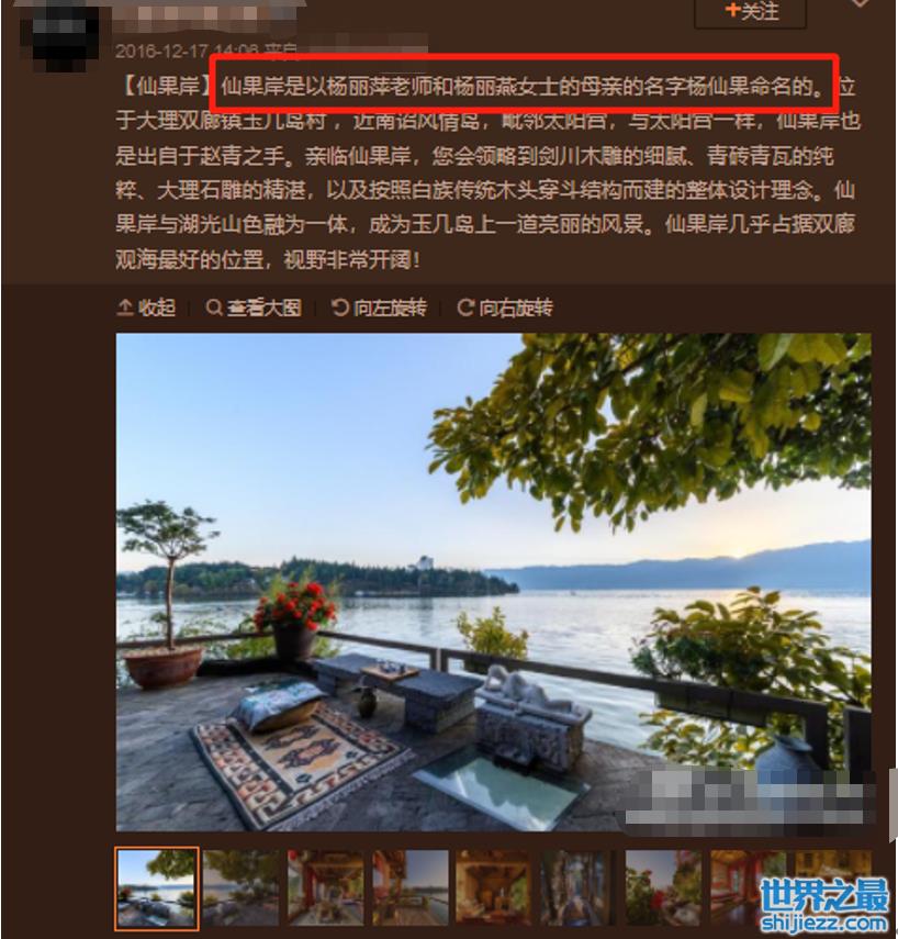 杨丽萍也在视频专门定位了该建筑的位置,名叫仙果岸,据网友爆料,这是杨丽萍专门以母亲的名字命名的,在洱海是最佳的观景位置,可见对于母亲,杨丽萍颇为上心,这栋房子很大程度上是为给母亲养老才建造的。