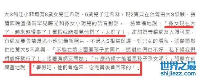 大S和汪小菲离婚后,一直都有刻意地保护两个孩子的成长,这一点大S和前婆婆张兰也达成了共识,张兰也说过,大S不让晒两个孩子的照片。