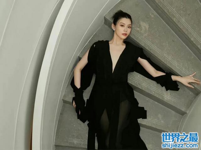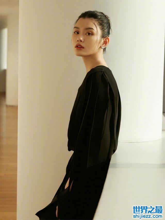 深V的设计还有薄纱的配合,加上她干干净净的露额头发型,整个人看起来很修长。