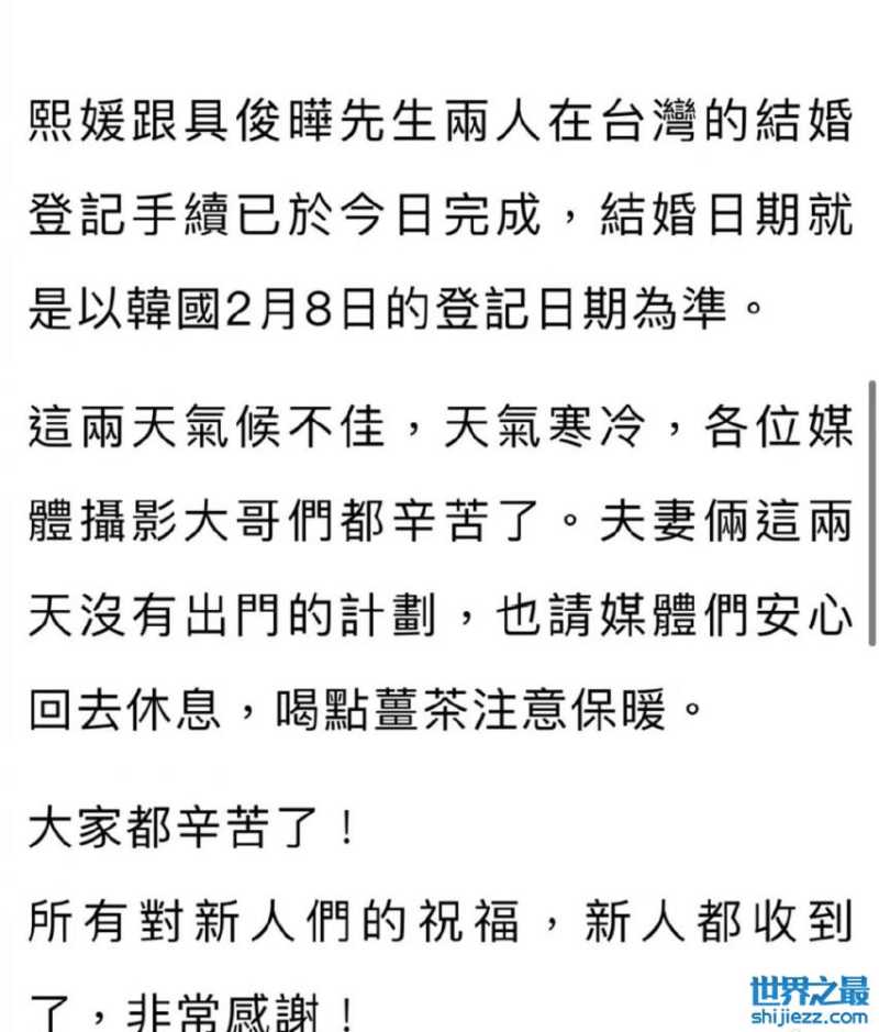 大S的经纪人称熙媛跟具俊晔先生两人在台湾的结婚登记手续已经于今日完成,结婚日子就是以韩国2月8日的登记日期为准。