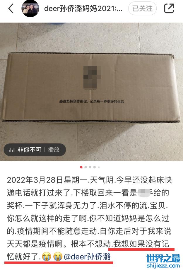 孙侨潞妈妈收到女儿的奖杯,她说:“一下子就浑身无力,泪水不停地流,宝贝,你怎么就这样走了啊,你不知道妈妈是怎么过的,疫情期间不能随意走动,自从你走后,对我来说天天都是疫情,根本不想动,我想如果没有记忆就好了”。