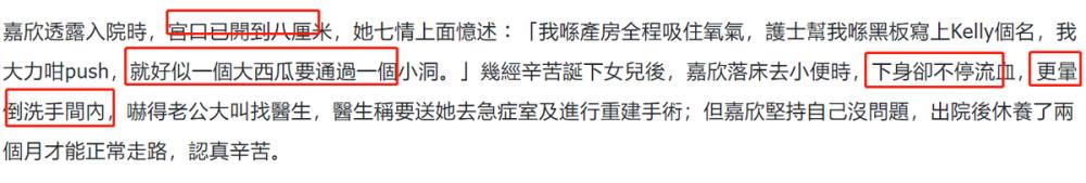 在钟嘉欣住院的时候,她宫口已经开到了8指,她自己把生孩子的过程比作,好像一个大西瓜要通过一个小洞,十分辛苦。生完孩子之后更加凶险,当时钟嘉欣想要去小便,结果下身流血不停,更是直接晕倒在洗手间内,吓得老公大叫找医生,之后更是休养了两个月才能正常走路。