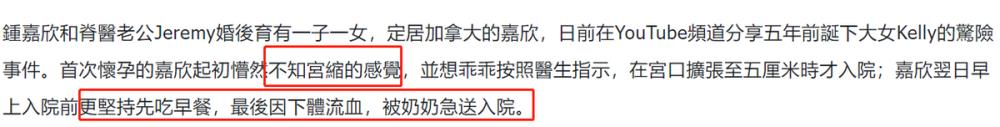 据悉,钟嘉欣在生第一胎时,没有经验不知道宫缩的感觉,并想听从医生的指示到宫口开5指再住院。最开始有症状的时候,钟嘉欣还是坚持先吃早餐再去医院,但是最后因为下体流血,被奶奶紧急送到医院。