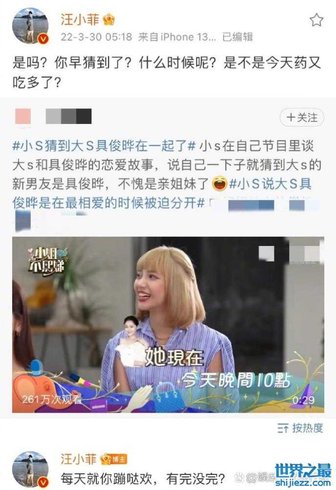汪小菲发文怼小S,起因就是小S在节目中聊到大S跟她说已交到男朋友时,就猜到姐姐应该是和具俊晔在一起了。