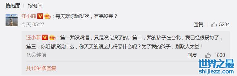 汪小菲怒怼并且喊话小S之后,在评论区是这样子说的:“第一我没喝酒,只是没完没了的。第二,我的孩子在台北,我已经很妥协了,第三,你姐都没说什么,你天天的跟这儿得瑟什么呢?为了我的孩子,别欺人太甚!”