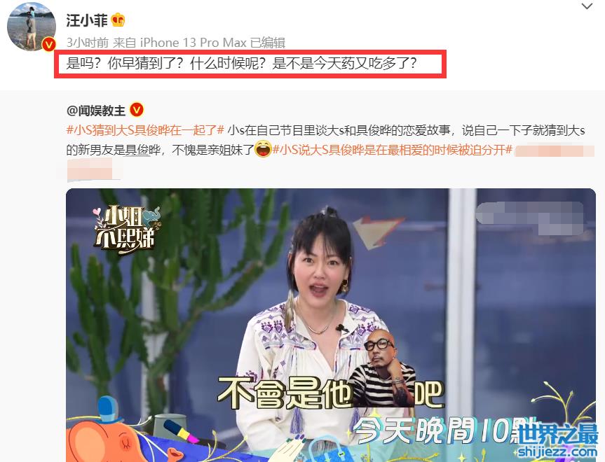 3月30日清晨,汪小菲猝不及防更新动态,转发了小S谈论姐姐大S与具俊晔感情的一段采访视频,可以看出,小S面对镜头的这段言论彻底激怒了汪小菲,转发动态的同时汪小菲还言辞激烈地予以评论“是吗?你早猜到了?什么时候呢?是不是今天的药又吃多了?”
