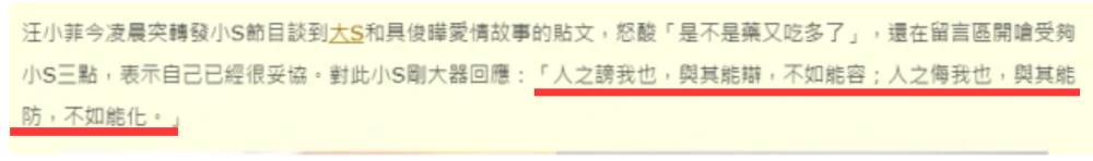 随后,小S通过媒体也给与了回应,用俗语表态 “ 人之谤我也,与其能辩,不如能容;人之侮我也,与其能防,不如能化 ”, 也就是别人说我,我不会跟他争,就宽恕原谅他人。别人侮辱我,与其防范,不如化解了。