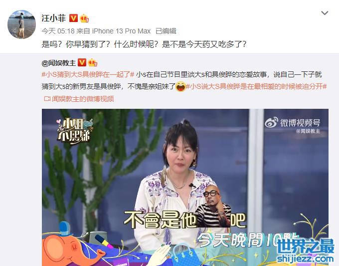 3月30日一大早,汪小菲就开始直接怒怼小S,只因为小S在视频中提到大S和新姐夫具俊晔的爱情。之后,汪小菲就把小S取关,还在评论区接着吐槽,怒斥小S天天蹦跶,嘚瑟,并让小S别欺人太甚,直接跟前小姨子闹掰。