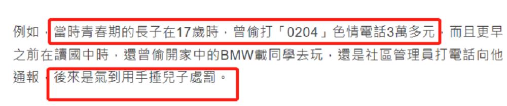 然而最不让他省心的还是自己的长子,大儿子在17岁的时候,曾经偷打色情电话花费6000多块,还曾经偷开家中的宝马带同学出去玩。更是气到用手锤儿子,结果被社区管理员通报。