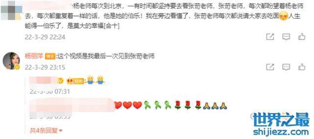 网友在这条视频下也回复到杨老师每次到北京都会坚持去看张苛老师,张苛也一直盼着杨丽萍去,张苛是杨丽萍的恩师,人生能得如此伯乐是莫大的幸福。杨丽萍也在评论区说到,这个视频是自己最后一次见到张苛老师。