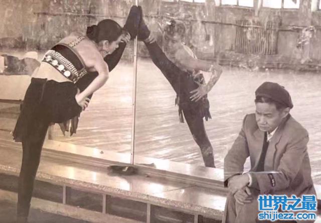 杨丽萍还在视频中晒出了自己从前在恩师张苛指导下练舞的照片,这张照片还是黑白的十分具有年代感,图中杨丽萍穿着舞台服面对镜子压腿,非常刻苦,老师张苛则是坐在一旁,表情严肃十分严格,不过正是这样的严格,杨丽萍的基本功才如此的扎实。