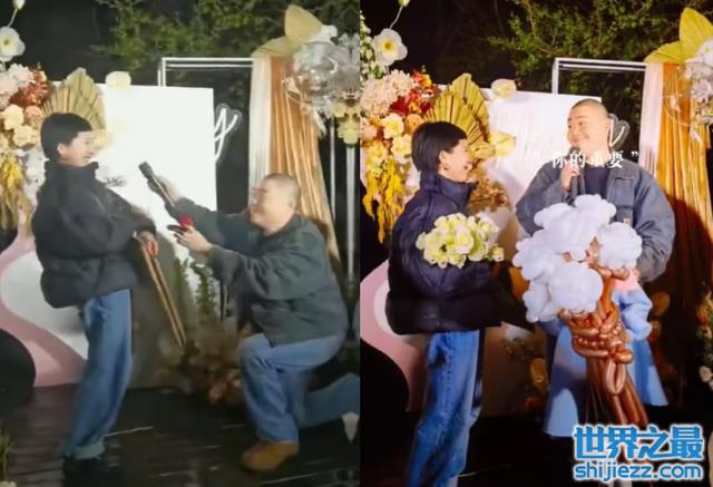 在求婚时郝劭文单膝跪地举着戒指,向女友说着甜言蜜语,在让女友回答时,郝劭文递上了话筒,女生害羞得向后仰。求婚成功后,郝劭文站起来深情地望着女生,两人一对比,女生便显得十分娇小。求婚现场摆放着很多鲜花,郝劭文手上还拿着一束气球鲜花,真是将浪漫贯彻到底。