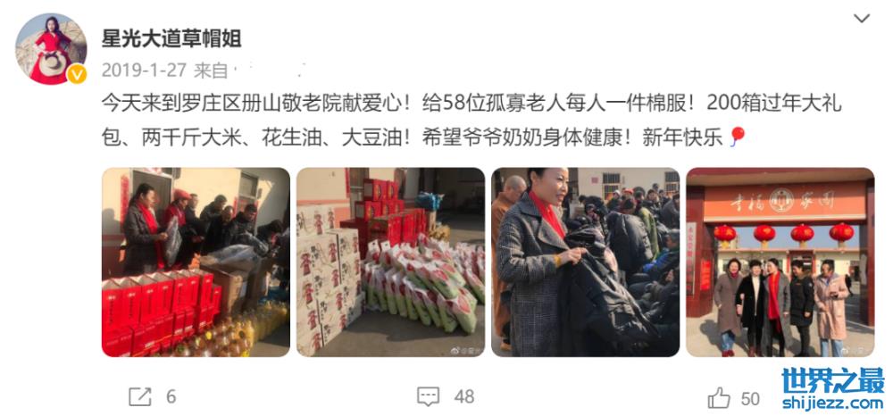 翻看草帽姐的社交账号,才发现她从2019年开始就经常分享她做公益的动态,比如2019年的时候,她就去敬老院看望照顾老人家,还给那些老人家送棉服,大米和花生油。