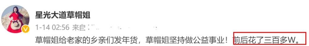 草帽姐曾自己透露,光是过年给家乡的乡亲们发年货,她前后就花了300多万。