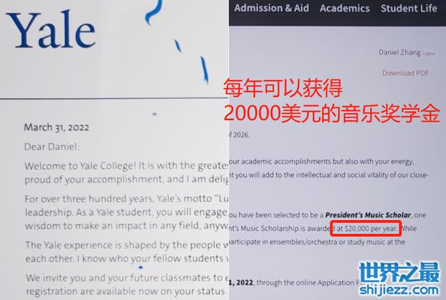 陈婷还晒出了两张张壹丁获得的录取通知书的照片,其中一张是耶鲁大学的录取通知书。在另一张录取通知书上我们可以看到,上面写着“如果你被选为总统音乐奖学金的获得者,每年可以获得20000美元的音乐奖学金”,折算成人民币大概为12万7千元左右,数值非常可观。